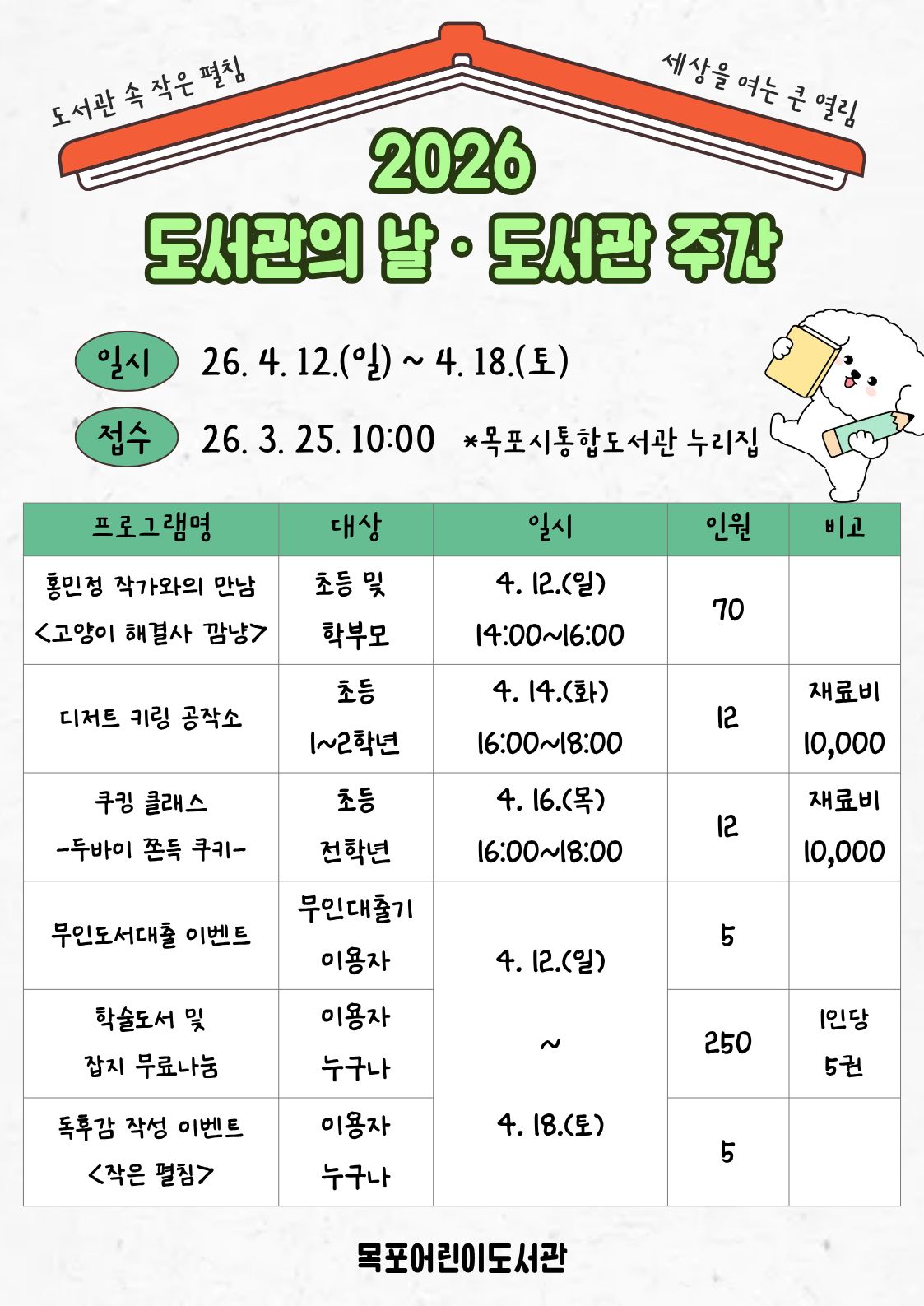접수: 3월 25일 10:00부터 (목포시통합도서관 누리집)