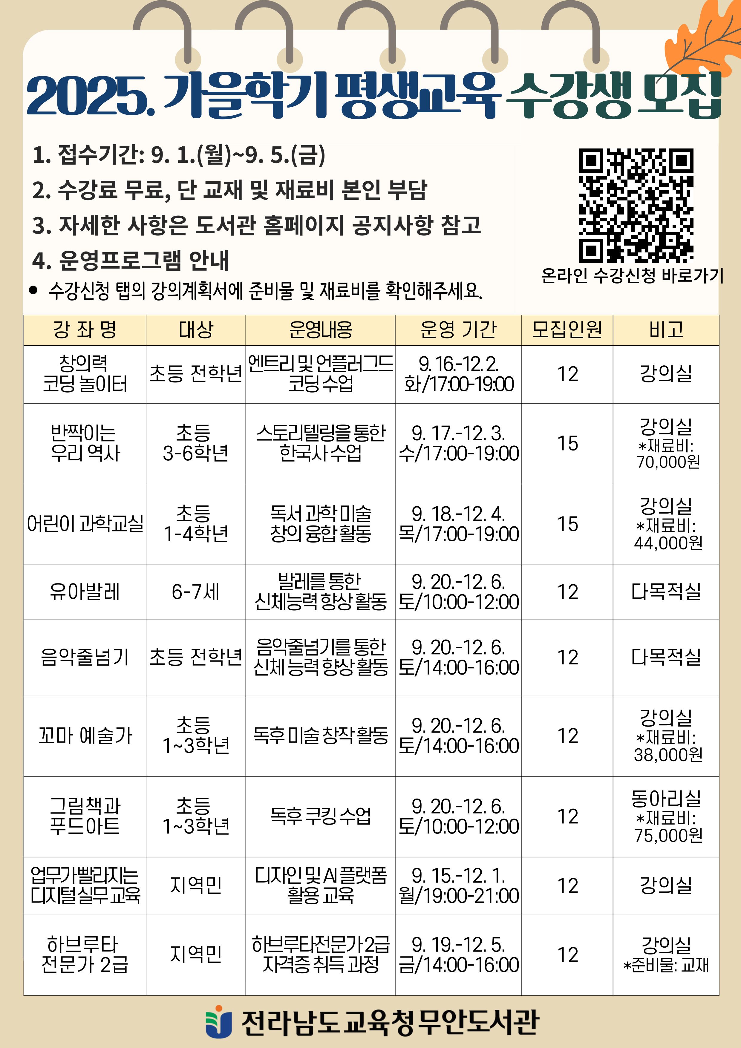 * 온라인 수강신청 후 모집 잔여 인원 발생시 오프라인 접수: 종합자료실, 9. 6.(토)