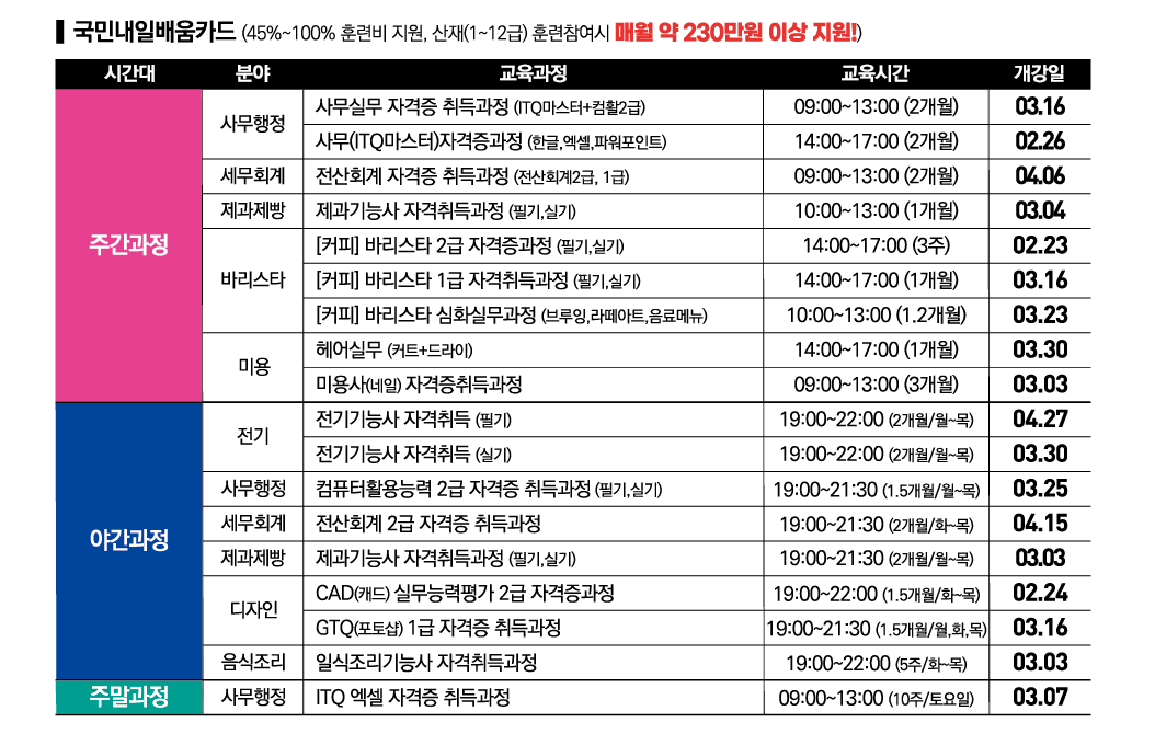 | 훈련수당 | 45%~100% 훈련비 지원 |