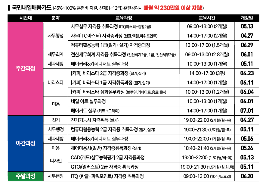 | 훈련수당 | 45%~100% 훈련비 지원 |