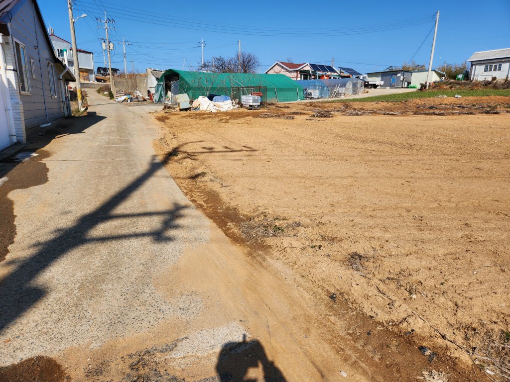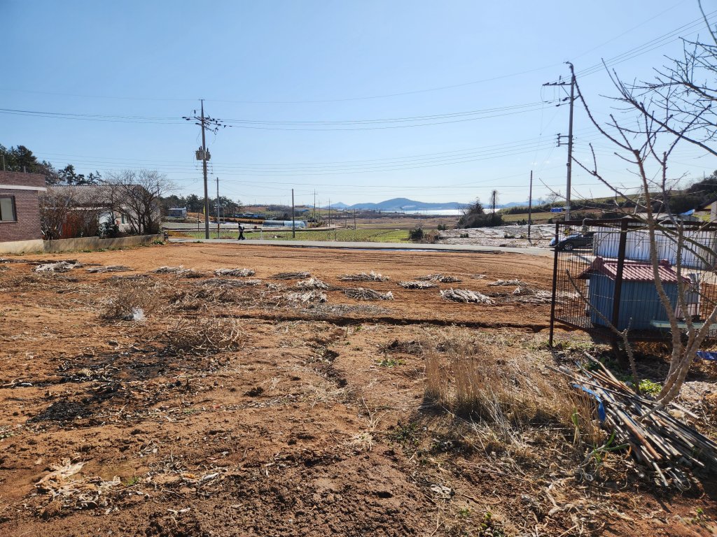​토지는 마을 맨 앞쪽으로 자리하고 있으며 전기나 수도 등의 인프라 구축도 어렵지 않아 보입니다 앞쪽으로는 막힘이 없어 탁 트인 시원함이 있으며 멀리 바다도 보입니다
