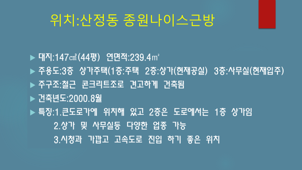 산정동 전체 지상3층대지147㎡ 건축239㎡ 큰 도로변,1층주택(26평),2층상가(30평),3층사무실(30평) 2억6천5백만원
