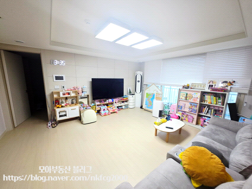 거실은 가족이 함께 모여 TV를 보거나 아이들이 놀기에 충분한 넓이로, 온 가족이 함께하는 시간이